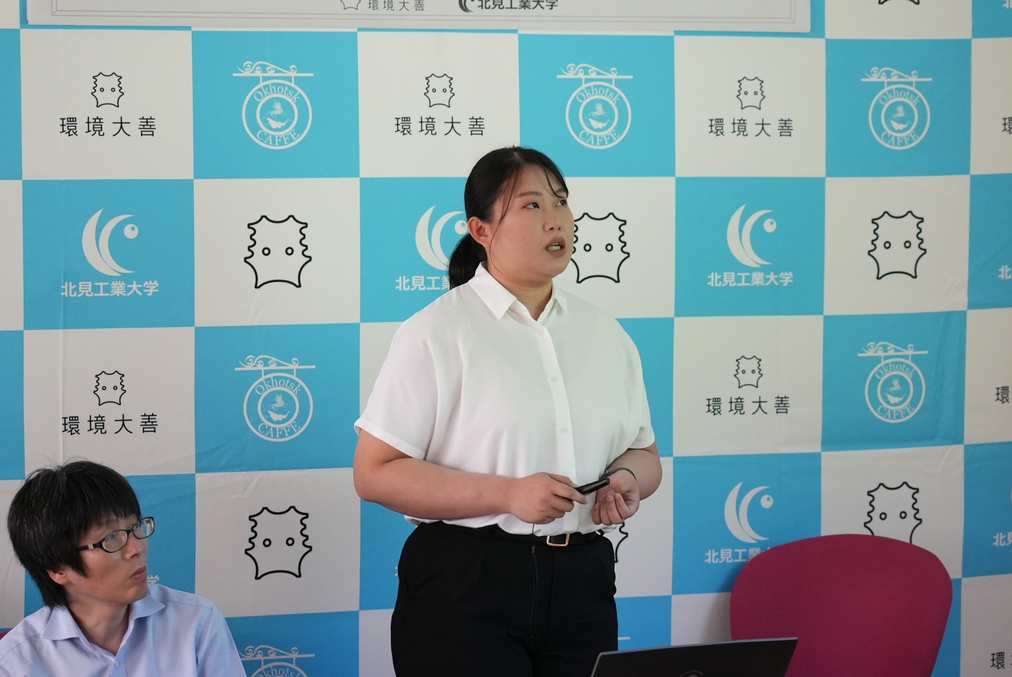(左)研究発表をする北見工業大学 タン ペイ ユー氏 (右)共同研究講座の展望を語る環境大善(株) 窪之内 誠 代表取締役CEO